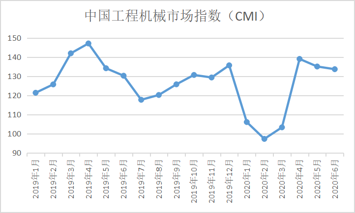 某网站公布的数据显示,2020年6月份中国工程机械市场指数(CMI)为133.67,同比提高2.62%,增幅扩大;环比降低1.04%,降幅收窄(依据CMI判断标准,130)
